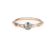 Featuring a one of a kind, hand selected "salt and pepper", double-sided Rose Cut Diamond center stone, framed by white tapered baguettes, and mixed grey and white brilliant-cut stones.