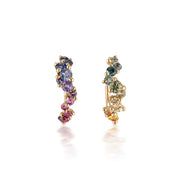 The latest pair of one of a kind staggered hoops! This pair features 2.52 carats of ombre color-phasing Sapphires, moving through the rainbow spectrum from dark blue to the palest yellow, hitting all the hues of purple, pink, red, teal, green, and orange along the way!