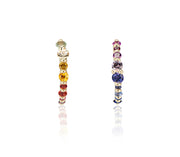 You were born to shine. Dare to be different in the most spectacular of ways. A spectrum of multicolored sapphires, hand-selected and sorted into a phasing color palette, from pastel teal through to boisterous purple, and pale yellow through to a vibrant pink. Mixed in sizes and intensity, each stone is hand-set into these extraordinary, eye-catching hoops.