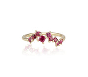 For the woman who seeks her own path. A story in ruby is a perfectly imperfect, irregular ramble, featuring princess-cut, rich, red rubies in a variety of sizes. Rebel-set and cast in place, every piece is handmade and no two are ever the same.